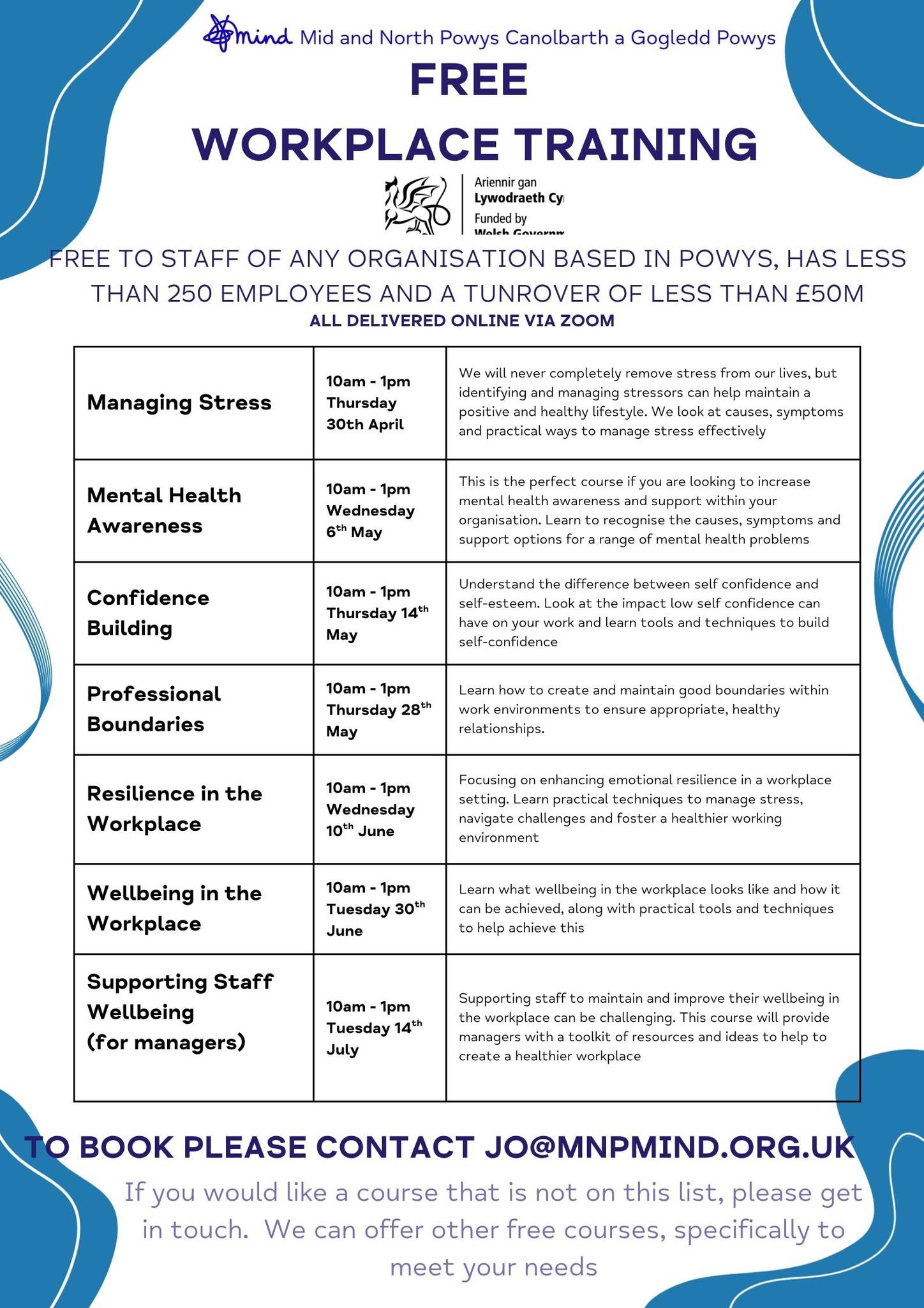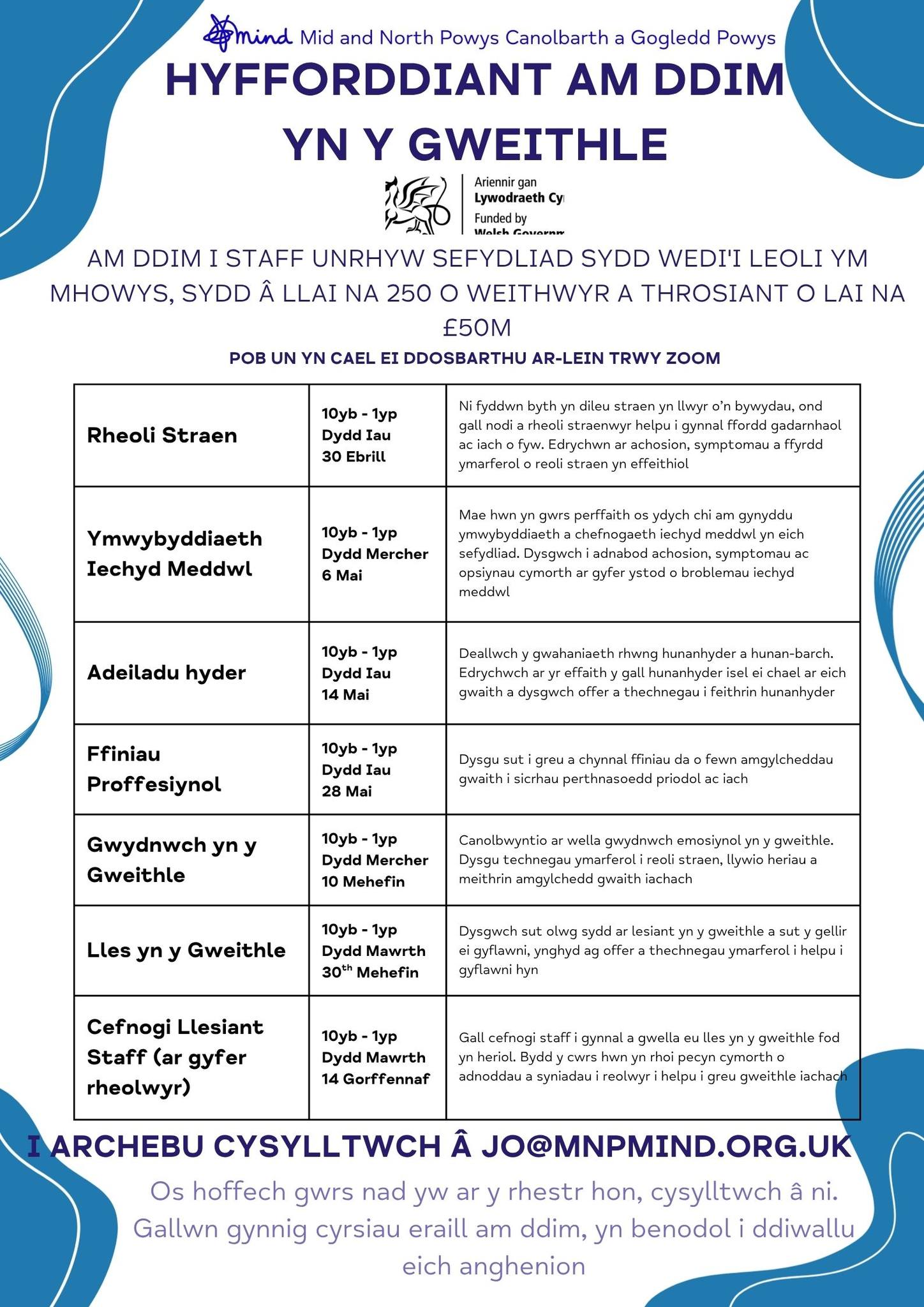 Am ragor o wybodaeth neu i archebu cwrs hyfforddi, cysylltwch â Jo yn jo@mnpmind.org.uk
